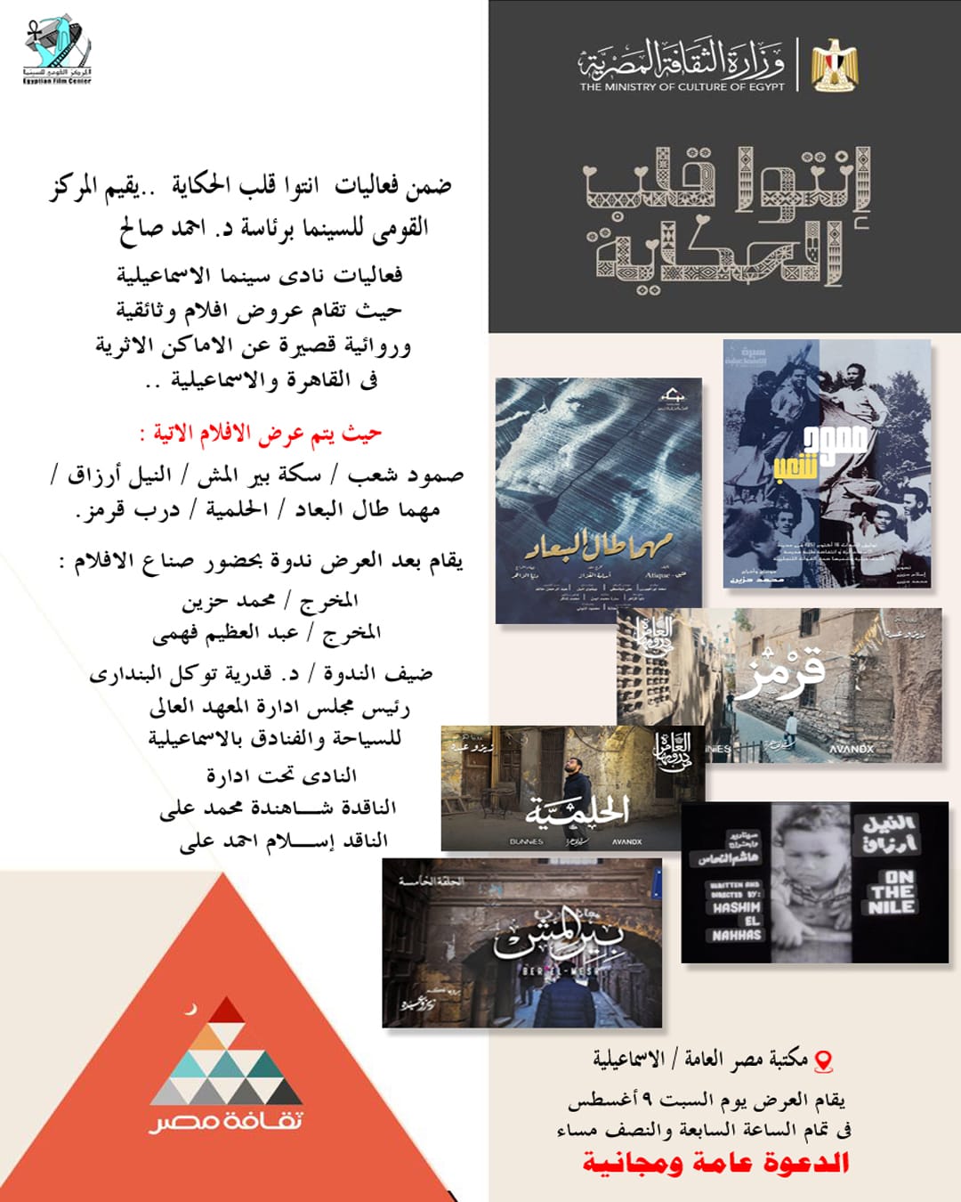 في إطار فعاليات مصر تتحدث عن نفسها محور انت قلب الحكاية ، والتي أطلقتها وزارة الثقافة المصرية برعاية الدكتور أحمد فؤاد هنو ، ينظم المركز القومي للسينما برئاسة الدكتور أحمد صالح فعاليات نادي سينما الإسماعيلية يوم السبت الموافق 9 أغسطس 2025 بمكتبة مصر العامة بالإسماعيلية في تمام السابعة والنصف مساء