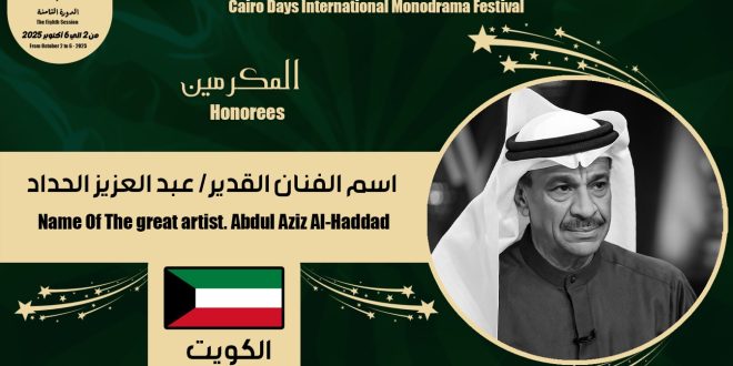 تحت رعاية الدكتور أحمد فؤاد هنو وزير الثقافة، يكرم مهرجان أيام القاهرة الدولي للمونودراما برئاسة المخرج الدكتور أسامة رؤوف، اسم رائد فن المونودراما بالكويت الفنان “عبد العزيز الحداد” الذى رحل عن عالمنا فى الثاني من يناير الماضي، بعد مسيرة حافلة بالأعمال الناجحة المتميزة، وذلك خلال فعاليات النسخة الثامنة للمهرجان المقامة فى الفترة من 2 حتى 6 أكتوبر المقبل .