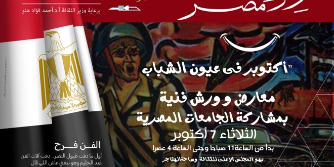 حيث يقام ببهو المجلس الأعلى للثقافة، معرضا فنيا بعنوان “أكتوبر بعيون الشباب ” يشارك فيه عدد من الجامعات المصرية بأعمال فنية مستوحاه من نصر أكتوبر المجيد، يعبر فيها الشباب عن رؤيتهم وفرحتهم بالنصر، ويضم المعرض مجموعة متنوعة من الفنون، مثل “الأزياء والديكور وطباعة المنسوجات والفنون الرقمية والذكاء الاصطناعى”، كما يعرض على شاشة عرض بالبهو، عدد من الأفلام الدعائية .