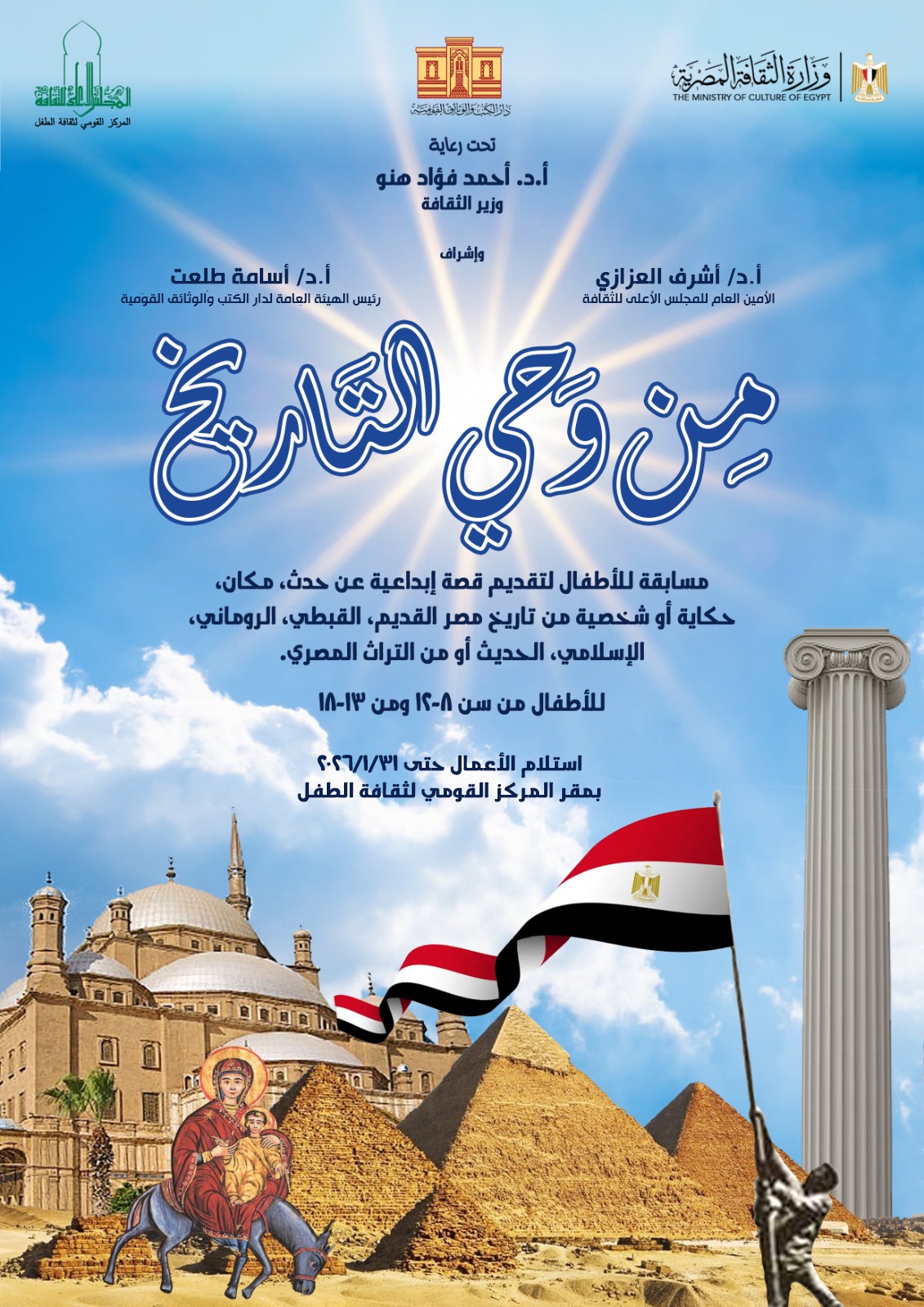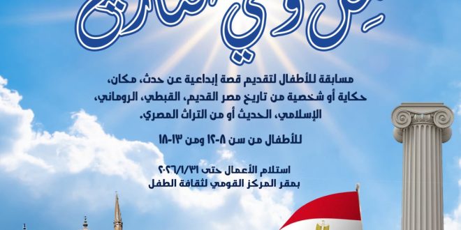 في إطار تكامل الجهود الثقافية التي تقدم للأجيال الناشئة بناءً على توجيهات الأستاذ الدكتور أحمد فؤاد هنو وزير الثقافة، وتأكيدًا على توجيهات الدولة المصرية برعاية المبدع الصغير، بالشراكة بين مركز توثيق وبحوث أدب الطفل بالهيئة العامة لدار الكتب والوثائق القومية برئاسة الأستاذ الدكتور أسامة طلعت، والمركز القومي لثقافة الطفل بالمجلس الأعلى للثقافة بأمانة الأستاذ الدكتور أشرف العزازي، تنطلق الدورة الأولى من المسابقة الأدبية للأطفال المصريين بعنوان: “من وحي التاريخ”، وذلك ضمن احتفاء وزارة الثقافة بذكرى نصر أكتوبر المجيد.
