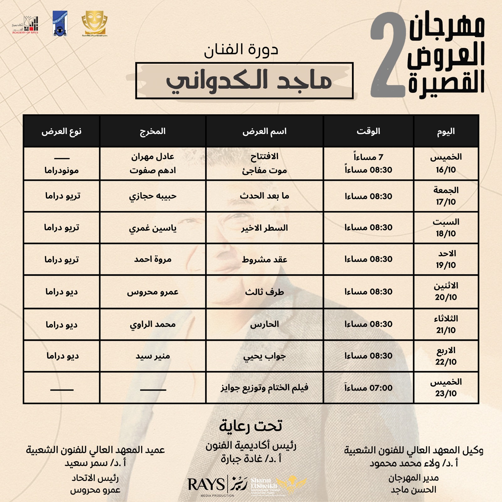 تحت رعاية الأستاذة الدكتورة غادة جبارة، رئيس أكاديمية الفنون، والأستاذة الدكتورة سمر سعيد، عميد المعهد العالي للفنون الشعبية، وتحت إشراف الأستاذة الدكتورة ولاء محمد، وكيل المعهد العالي للفنون الشعبية، يُعلن المعهد العالي للفنون الشعبية عن انطلاق فعاليات الدورة الثانية من مهرجان العروض القصيرة، والتي تحمل اسم الفنان ماجد الكدواني.
