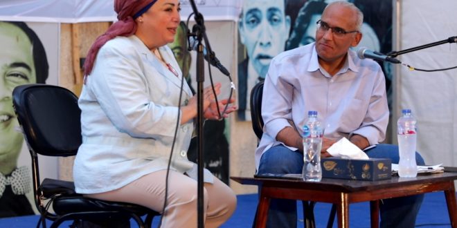حلت د. نبيلة حسن- الأستاذ بالمعهد العالي للفنون المسرحية بأكاديمية الفنون، ضيفة على فعالية “مساحة حرة” إحدي فعاليات المعرض، وذلك بمقر المركز القومي للمسرح والموسيقى والفنون الشعبية، وأدار الحوار معها بحضور جمهور المعرض د.محمد أمين عبدالصمد المشرف على التراث الشعبي بالمركز، والذي وصف اللقاء بأنه “فرصة لرؤية شخصية الدكتورة نبيلة بعيداً عن الإطار الرسمي”.