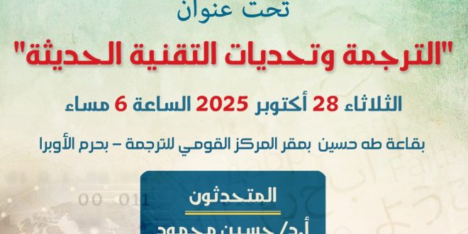 يشارك في الصالون كلٍ من: الأستاذ الدكتور حسين محمود، والأستاذ أحمد عبد اللطيف، والأستاذة نسمة دياب، ويدير الحوار الأستاذ وليد عبد العزيز، وذلك في تمام الساعة السادسة من مساء يوم الثلاثاء الموافق ٢٨ أكتوبر ٢٠٢٥، بقاعة طه حسين بمقر المركز القومي للترجمة بحرم الأوبرا.