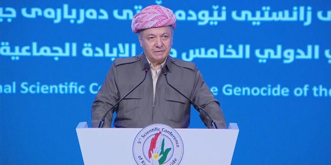 وقال مسعود بارزاني، اليوم الثلاثاء، خلال كلمة ألقاها أمام ضيوف المؤتمر الدولي الخامس للتعريف بالإبادة الجماعية، المهم المتعلق بجرائم الإبادة الجماعية في ضد الشعب الكوردي، المنعقد في محافظة دهوك، بحضور شخصيات سياسية وأكاديمية، “علمنا أن جزءاً كبيراً من الكورد الفيليين والبارزانيين قد تم نقلهم إلى مناطق عكاشات والقائم، وتم اختبار الأسلحة الكيميائية عليهم، ومنذ ذلك اليوم لم نفكر قط في الانتقام؛ وخاصة في فترة انتفاضة عام 1991، حيث وقع فيلقان من الجيش العراقي بيد المواطنين الكورد وقوات البيشمركة، وفي ذلك الوقت لم يُقتل أي جندي عراقي ولم يُهان. هؤلاء كانوا نفس الجنود الذين دمروا أكثر من 4500 قرية من قرنا، ونفذوا حملات الأنفال وارتكبوا العديد من الجرائم الأخرى ضد الشعب الكوردي”.