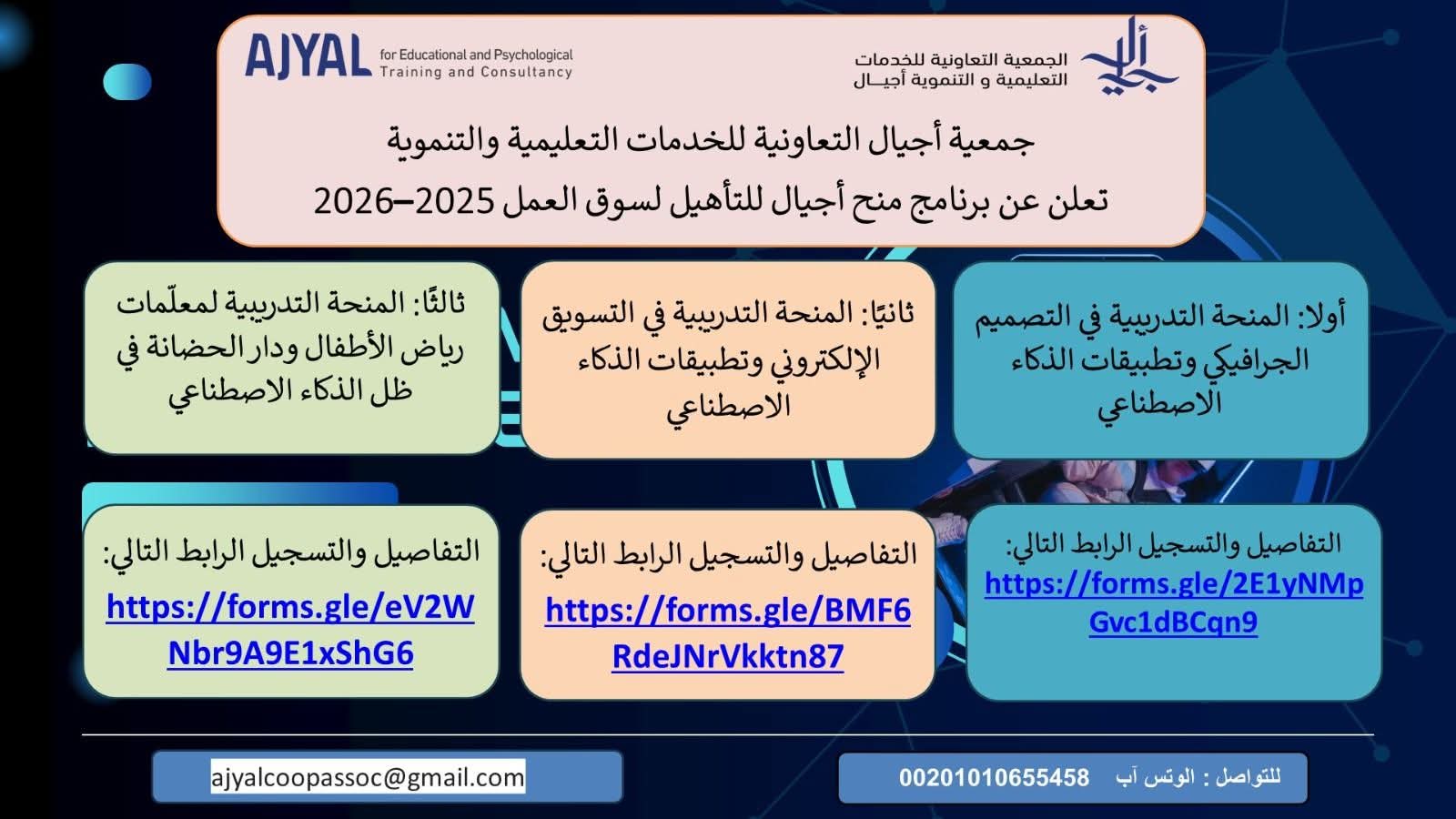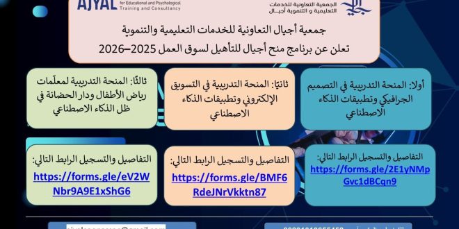 التفاصيل، و المنحة التدريبية في التسويق الإلكتروني وتطبيقات الذكاء الاصطناعي، وكذا المنحة التدريبية لمعلّمات رياض الأطفال ودار الحضانة في ظل الذكاء الاصطناعي.