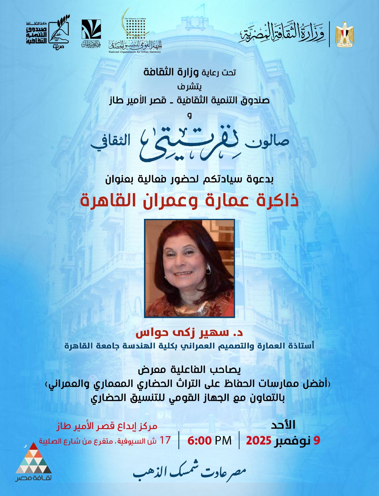 من أجل تعزيز الحوار الثقافي والفكري حول قضايا التراث والهوية في ضوء التطورات المعاصرة، يعقد صالون نفرتيتي الثقافي فعالية جديدة بعنوان “ذاكرة عمارة وعمران القاهرة”. يستضيف فيها الدكتورة سهير زكي حواس، أستاذ العمارة والتصميم المعماري بكلية الهندسة – جامعة القاهرة، وذلك يوم الأحد المقبل٩ نوفمبر في تمام الساعة السادسة مساء بقصر الأمير طاز التابع لقطاع صندوق التنمية الثقافية.