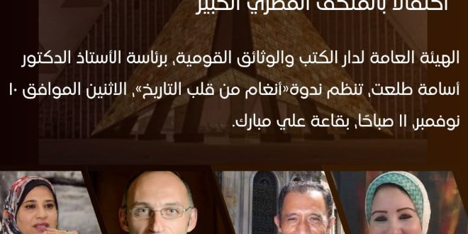 تحت رعاية وزارة الثقافة، واحتفاءً بافتتاح المتحف المصري الكبير، تنظم دار الكتب والوثائق القومية برئاسة الأستاذ الدكتور أسامة طلعت ندوة بعنوان “أنغام من قلب التاريخ”، في تمام الساعة الحادية عشرة من صباح يوم الاثنين الموافق ١٠ نوفمبر، وذلك في قاعة علي مبارك بدار الكتب.
