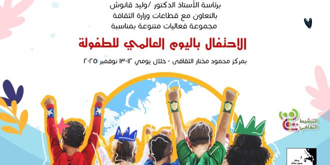 برعاية الدكتور أحمد فؤاد هنو وزير الثقافة وتحت شعار “مصر تتحدث عن نفسها” تشارك دار الأوبرا المصرية برئاسة الدكتور علاء عبد السلام فى فعاليات إحتفالات اليوم العالمى للطفولة التى ينظمها قطاع الفنون التشكيلية برئاسة الدكتور وليد قانوش بالتعاون مع مختلف قطاعات وزارة الثقافة وتقام بمركز محمود مختار الثقافى .