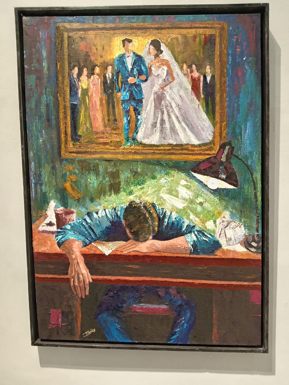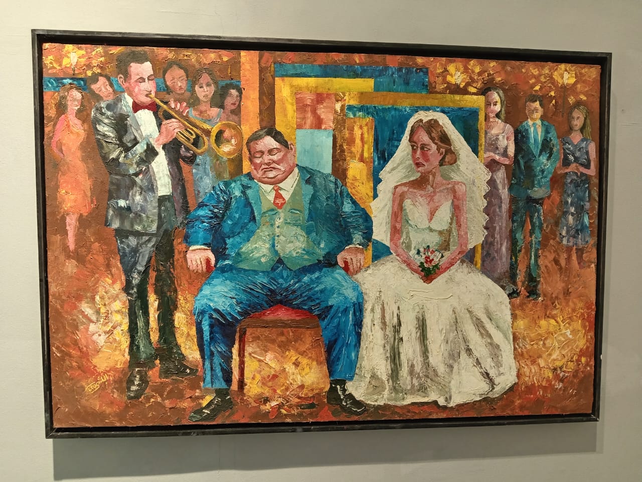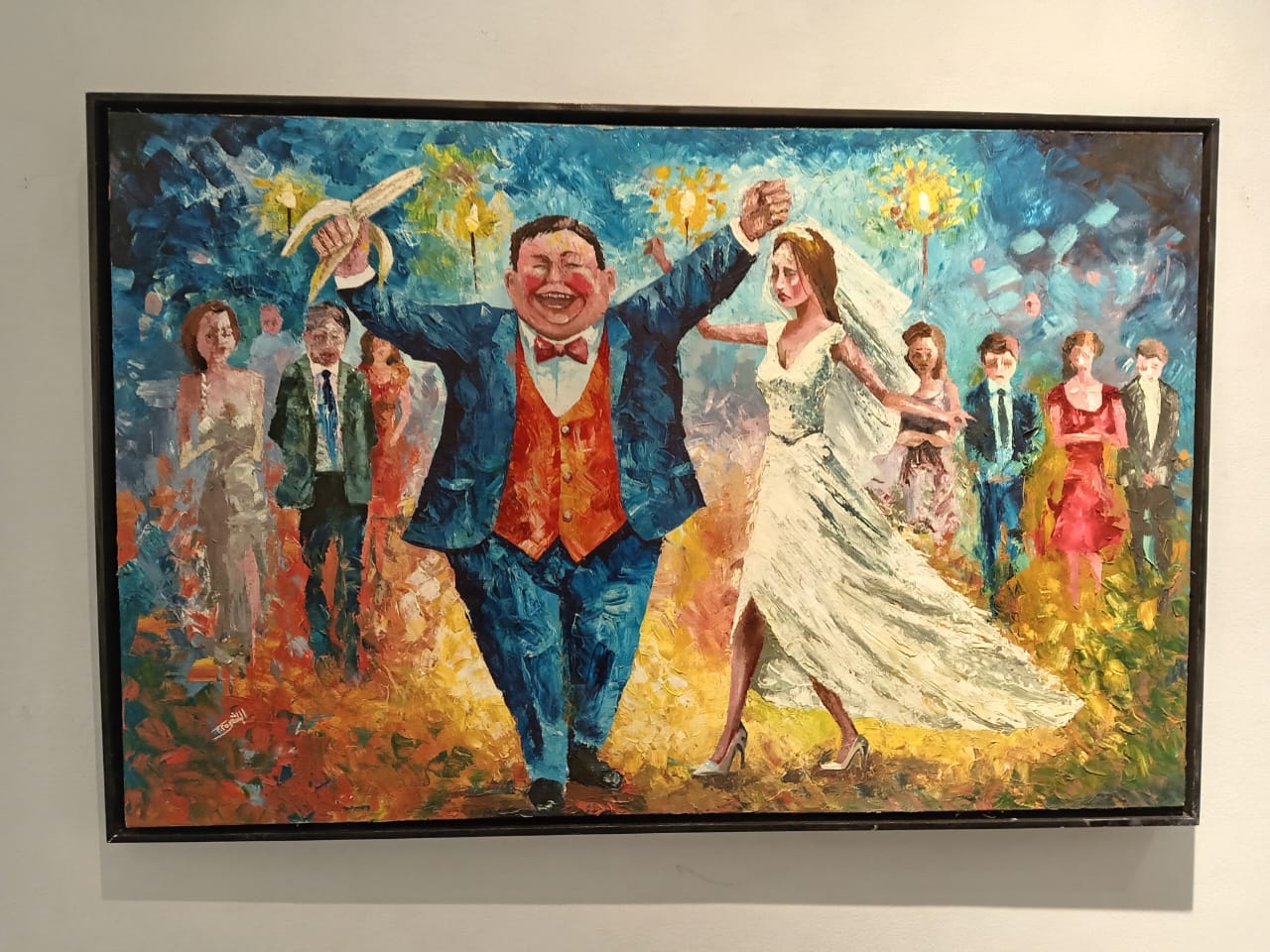 وتداخل الألوان (الانسجام الجماعي) بضربات سكين التلوين المتلاحقة والمتداخلة تعكس فلسفة “الجمع”، ففي الفرح، تذوب الفردية وتلتحم الأرواح، تماماً كما تذوب الألوان المائية أو الزيتية لتشكل نسيجا واحدا متناغماً، تتفاعل به الشخوص مع خلفيات المكان ويذوب الفراغ والأرضيات، فاللون في هذا المعرض هو انتصار “الوجود” على “العدم”، البهجة اللونية هي صرخة حياة في وجه كارهيها، أما الضوء فينبع من الداخل لا يأتي من مصدر خارجي (كالشمس أو المصباح) بقدر ما يبدو وكأنه ينبعث من شخوص اللوحات ومن تفاصيل الاحتفال ذاته، ويواجه الفنان عتمة الخلفية (التي قد ترمز للمجهول أو الليل) بكتل ضوئية ساطعة تتركز في بؤرة الاحتفال.