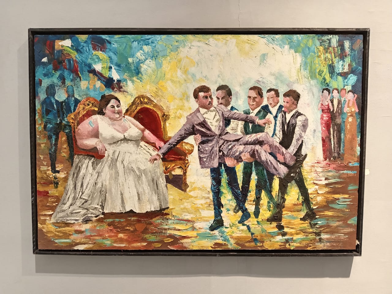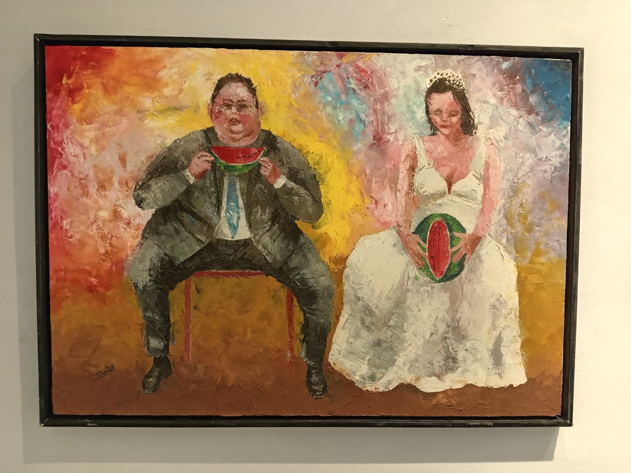واستطرد مخاطبا جمهور المعرض: لا أنظر للون باعتباره صبغة كيميائية، بل يصنع اللون سيمفونية خاصة بها “طاقة” واهتزاز، ففي “ليلة فرح”، لم أختر الألوان لملء الفراغات، بل جعلتها تتحدث عن صخب الحياة المقدس، فالأحمر والبرتقالي (عنفوان العاطفة) تسيطر الألوان الحارة على المشهد، فهي تمثل دماء الحياة التي تضخ في عروق اللوحة، الأحمر هنا ليس لونا للخطر، بل هو لون الحب، الصخب، ودقات الطبول التي نسمع صداها بأعيننا.