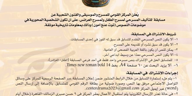 وتدعو وزارة الثقافة المصرية جميع الكُتّاب والمبدعين من مختلف الأعمار والتخصصات إلى المشاركة في هذه المسابقة، والمساهمة في إثراء المحتوى المسرحي الموجه للأطفال، بما يُرسخ قيم الانتماء والمعرفة، ويُعيد تقديم رموزنا التاريخية في صورة إبداعية تليق بعظمة مصر وتاريخها.