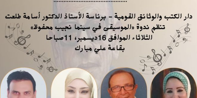 وتُعقد الندوة يوم الثلاثاء الموافق 16 ديسمبر 2025، بقاعة علي مبارك، بدار الكتب والوثائق القومية، حيث تناقش العلاقة بين الموسيقى والدراما السينمائية في أفلام نجيب محفوظ، ودورها في التعبير عن رؤاه الأدبية والإنسانية.