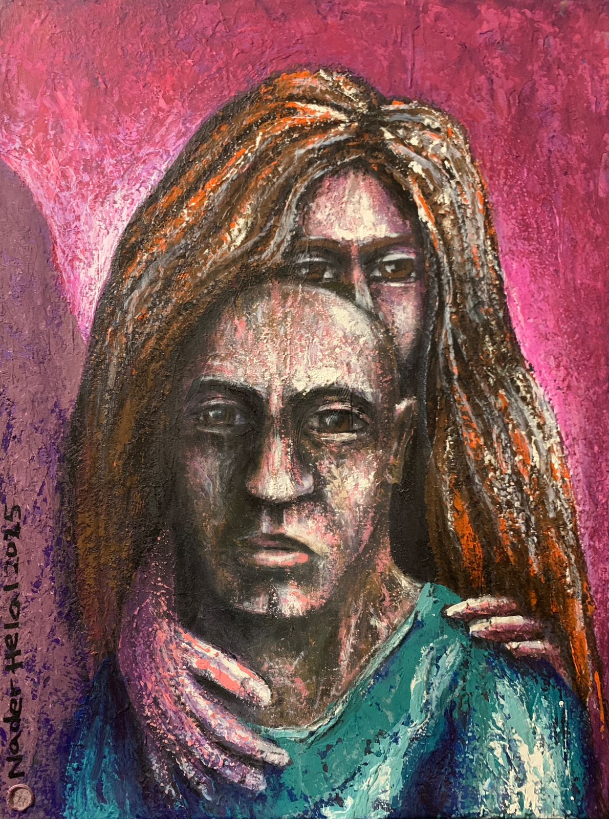 ويستكمل: في علم النفس الجمالي، يرتبط هذا النوع من التلوين بتجارب الانغماس والانفعال القسري، حيث يُستدرج المتلقي إلى حالة شعورية أقرب إلى الاحتكاك منها إلى التأمل الهادئ. اعتقد ان نادر هلال ليس معنيا باقتراح حلًّا تركيبياً يوحّد هذه الانقسامات، بل يعرضها بوصفها شرطًا معاصرًا للذات. الحضن لا يلغي الانشطار، والوردة لا تعالجه، لكنهما يمنحان الجسد إمكانية الاستمرار.