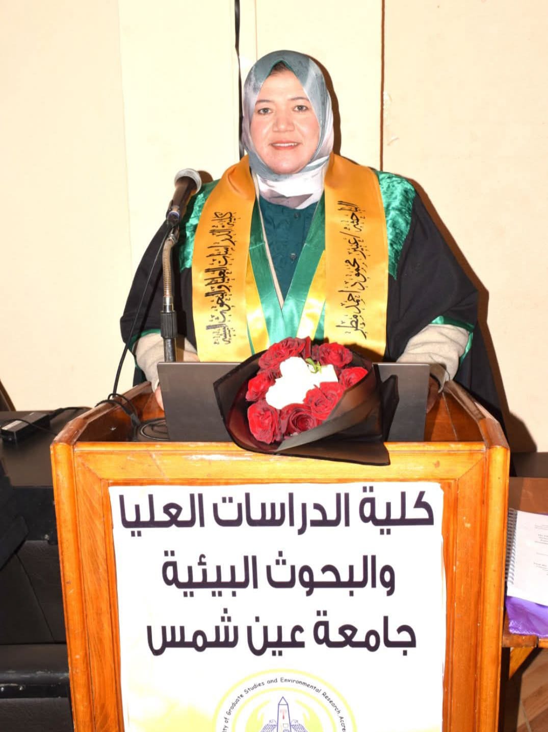 جامعة عين شمس، مناقشا، والدكتورة صفية أحمد العريبي المدرس بكلية الدراسات العليا والبحوث البيئية قسم العلوم التربوية والإعلام البيئي، مشرفا.