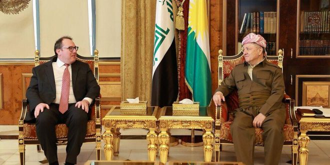 استقبل الزعيم الكردي مسعود بارزاني، اليوم الأحد، في بيرمام، القائم بأعمال السفارة الأمريكية في العراق، جوشوا هاريس، والقنصل العام للولايات المتحدة الأمريكية في إقليم كوردستان، ويندي غرين.