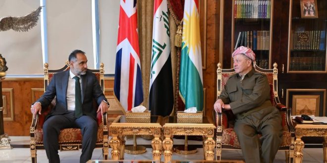 استقبل الزعيم الكردي مسعود بارزاني، اليوم الاثنين، في بيرمام، السيد عرفان صديق، السفير البريطاني لدى العراق.