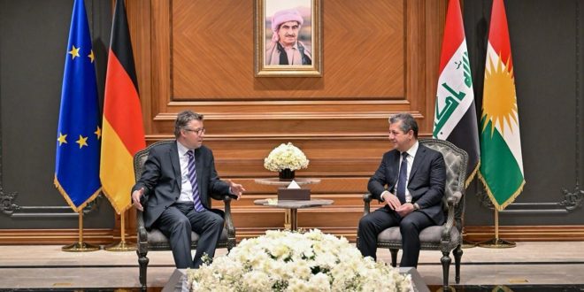 استقبل رئيس حكومة إقليم كوردستان مسرور بارزاني، الأربعاء، في أربيل، وفداً ألمانياً برئاسة وكيل وزارة الخارجية جيزا أندرياس فون غاير.